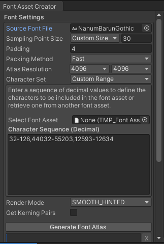 4. Generate Font Atlas 클릭 후 결과가 나오면 Save버튼을 눌러 Asset 저장