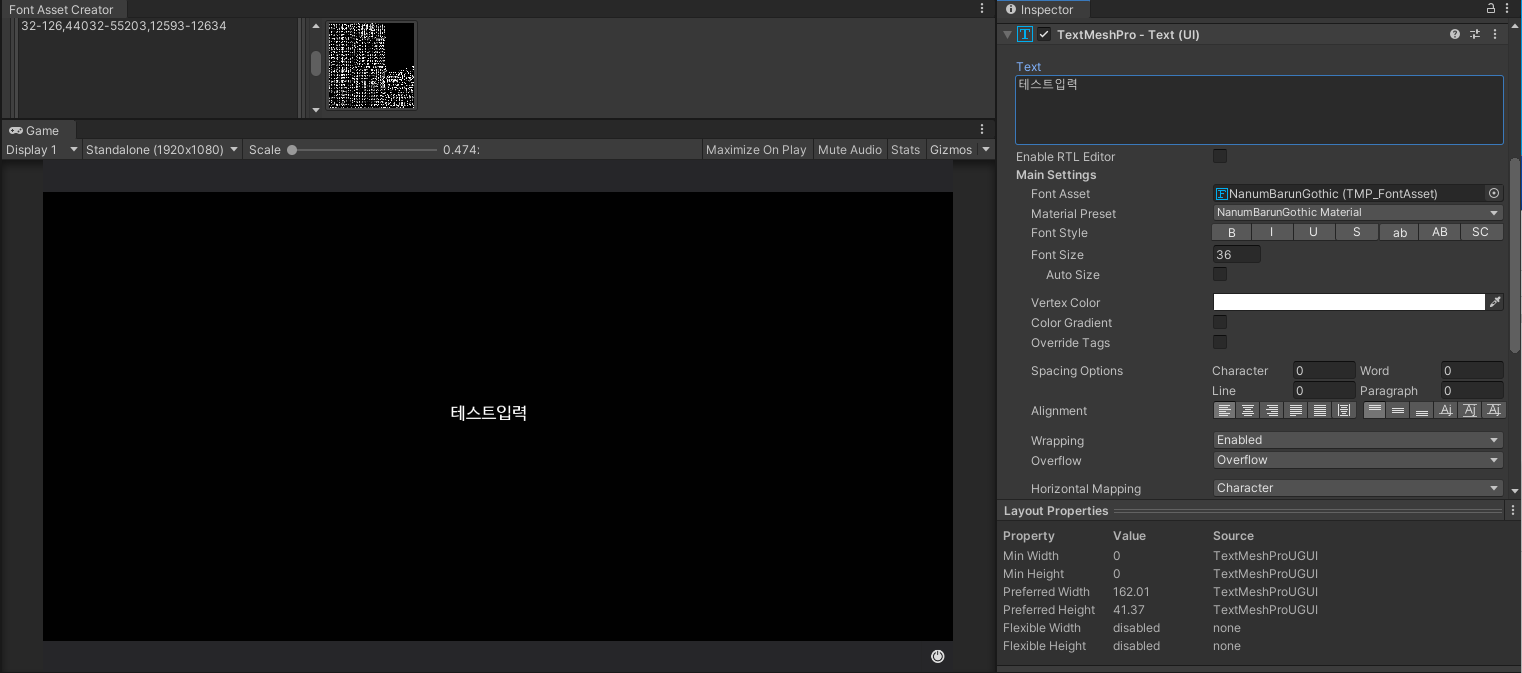 5. 저장한 Font Asset을 TextMeshPro에 Font로 삽입하면, 한글 입력 가능